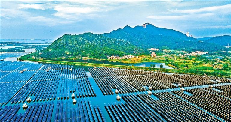 6月10日,江西省瑞昌市武蛟乡达尔湖50兆瓦光伏发电站与周边景致相映成景。近年来,瑞昌市因地制宜实施“渔光互补”光伏电站项目,发挥自然资源效应,形成了“水上能发电、水下能养鱼”的生态景象。