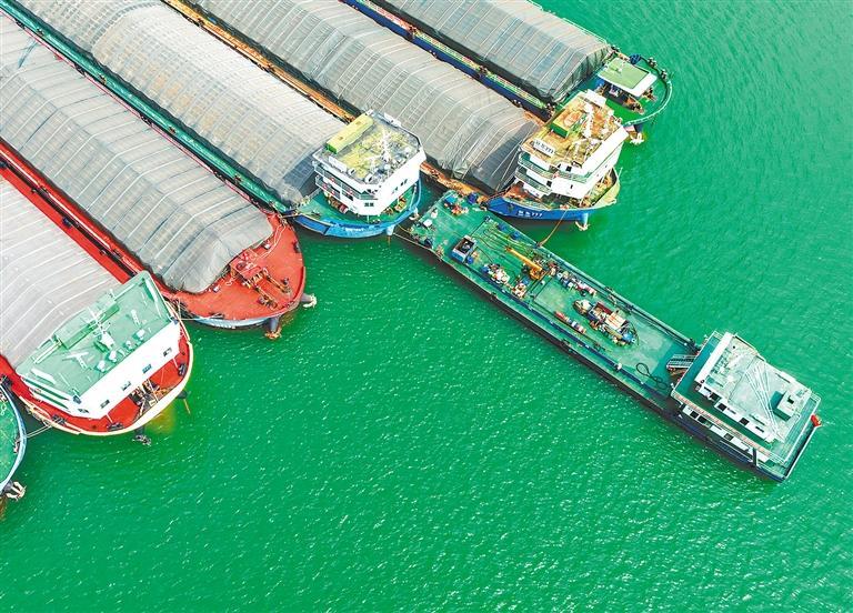 近日,湖北省宜昌市秭归县一艘垃圾、污水接收船在待闸锚地接收船舶污水。2020年年初,秭归县在三峡大坝上游建设船舶污染物接收转运秭归服务区,实现船舶污染物零入江,保障三峡库区水环境安全。郑家裕摄(中经视觉)