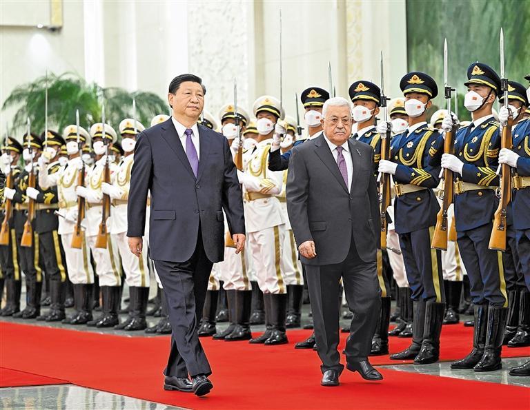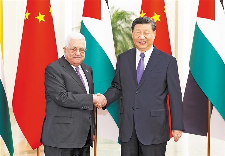 习近平指出,中巴两国是相互信任、彼此支持的好朋友、好伙伴。中国是最早承认巴勒斯坦解放组织和巴勒斯坦国的国家之一,始终坚定支持巴勒斯坦人民恢复民族合法权利的正义事业,推动巴勒斯坦问题早日得到全面、公正、持久解决。中方支持巴勒斯坦成为联合国正式会员国,将继续在多边场合为巴方仗义执言、主持公道,愿继续向巴方提供力所能及的援助,帮助巴方缓解人道主义困难、开展重建。中方愿同巴方以建立战略伙伴关系为契机,继续在彼此核心关切问题上坚定相互支持,全面推进各领域友好合作,深化共建“一带一路”合作,加快中巴自由贸易协定谈判,加强治国理政经验交流,赓续传统友好。