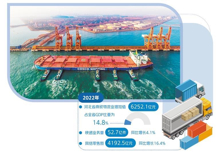 首衡高碑店农副产品物流园商贸交易高速增长,是河北全面建设全国现代商贸物流重要基地的一个缩影。“河北全国现代商贸物流重要基地建设全面提速,2022年全省商贸物流业增加值6252.1亿元,占全省GDP比重为14.8%;快递业务量52.7亿件,居全国第五位,同比增长4.1%,增速高于全国平均水平2个百分点;网络零售额4192.5亿元,同比增长16.4%,增速高于全国平均水平12.4个百分点。”河北省商务厅厅长张泽峰说。