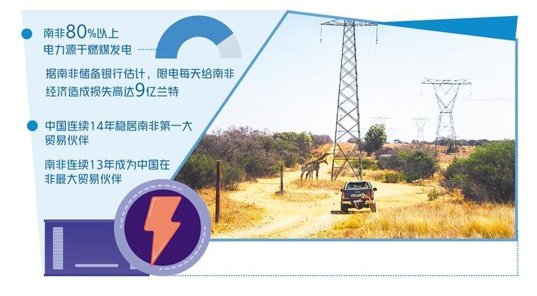 南非80%以上的电力源于燃煤发电。当前,南非正经历前所未有的电力短缺。随着南非燃煤电厂设施老化,南非国家电力公司经常在全国范围内实施轮流停电措施,防止用电需求过大而导致电网崩溃。每天少则2个小时、多则12个小时的限电严重影响了民众生活以及工商业的生产经营活动。据南非储备银行估计,限电每天给南非经济造成的损失高达9亿兰特(约合3.5亿元人民币)。