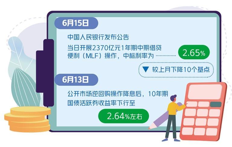 货币政策逆周期调节接续发力。6月15日,中国人民银行公告称,当日开展2370亿元1年期中期借贷便利(MLF)操作,中标利率为2.65%,较上月下降10个基点。在6月13日公开市场逆回购和各期限常备借贷便利(SLF)利率均下调10个基点后,MLF“降息”也随之落地。