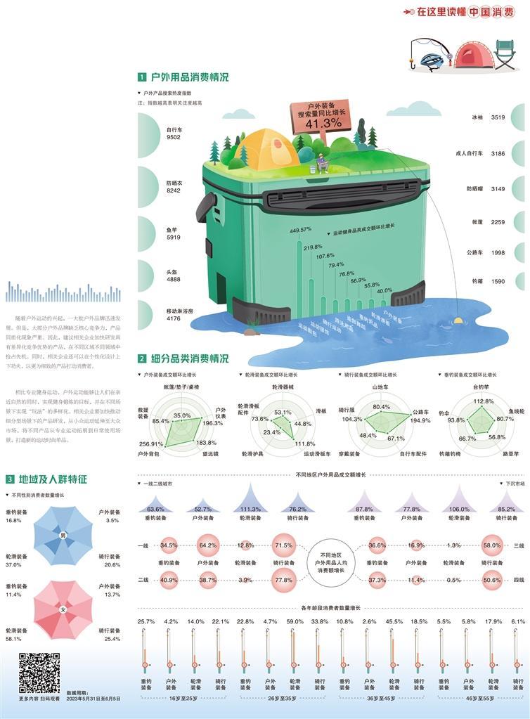 从消费端看,户外运动兴起带旺了相关产品消费。其中,“露营热”让相关装备销量大增,并衍生出“露营+飞盘”“露营+骑行”等个性化玩法;骑行、钓鱼、轮滑等户外运动则更讲究休闲性,让过往强调专业性的户外运动更加亲民,成为人人皆可参与的大众运动。同时,随着越来越多年轻人参与户外运动项目,户外运动的社交属性逐渐“拉满”,兴趣社交成为影响消费者户外休闲消费决策的重要因素。