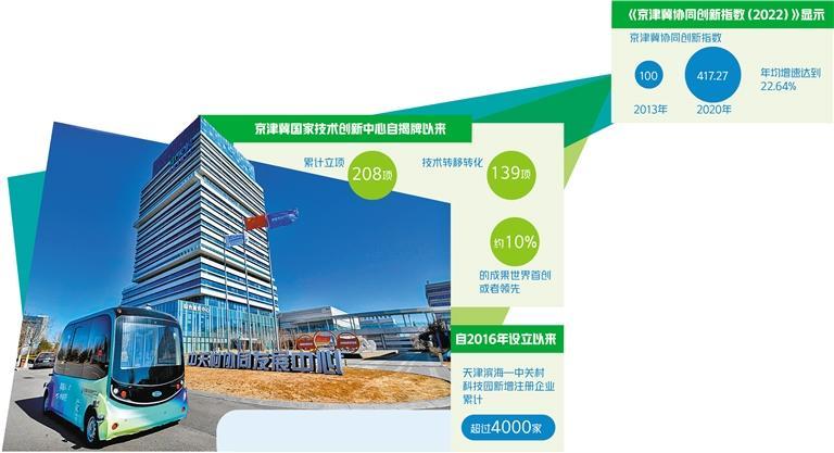 京津冀协同发展战略实施以来,三地按照“一张图”规划、“一盘棋”建设、“一体化”发展,在强化协同创新和产业协作、构建产学研协作新模式、强化企业的创新主体地位等方面取得了重要进展。《京津冀协同创新指数(2022)》显示,2013年到2020年,京津冀协同创新指数从100增长到417.27,年均增速达到22.64%,其中,2018年至2020年保持高速增长,一个更加紧密的协同创新共同体正在京津冀加速成长。