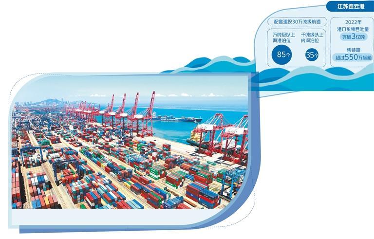 连云港港开港于1933年,经过90年的开发建设,现已构架连云港区、徐圩港区、赣榆港区、灌河港区“一港四区”格局,配套建设30万吨级航道,万吨级以上海港泊位85个、千吨级以上内河泊位35个,最大泊位等级30万吨级,综合通过能力约2.2亿吨,其中集装箱320万标箱。2022年,港口货物吞吐量突破3亿吨、集装箱超过550万标箱。
