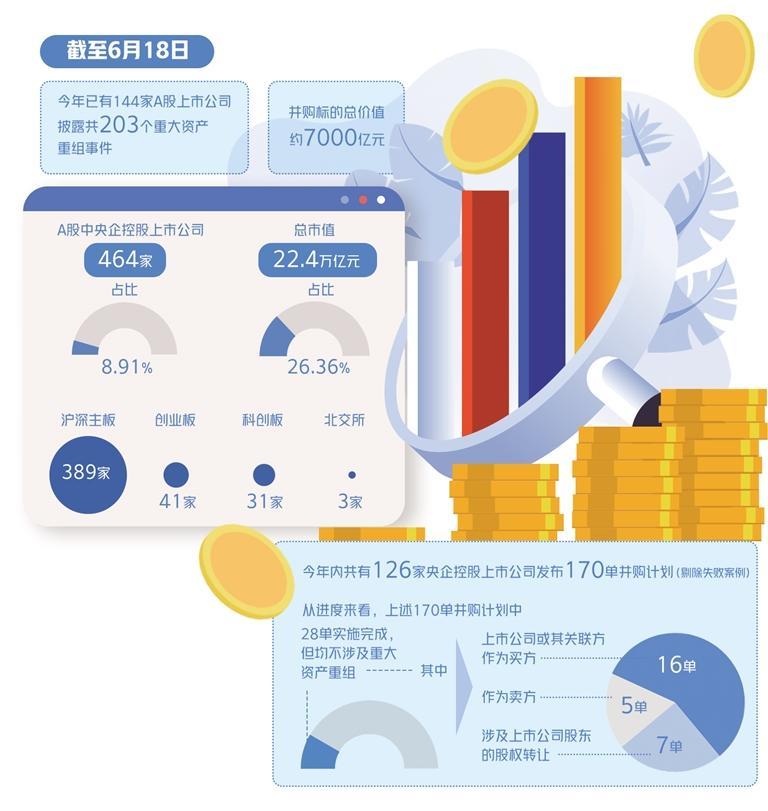 同花顺iFinD数据显示,截至6月18日,今年已有144家A股上市公司披露共203个重大资产重组事件,并购标的总价值约7000亿元。