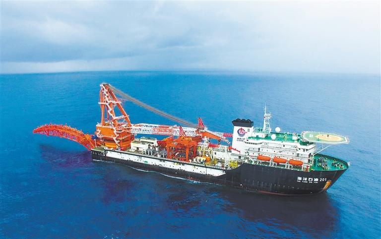 6月22日,在海南陵水海域,“深海一号”大气田二期工程的关键控制性工程——直径20英寸、总长度约115千米的海底油气长输管道铺设完工,标志着我国深水长输海底管道建设能力和深水装备技术实现重要突破。这是22日拍摄的亚洲首艘3000米级深水铺管起重船“海洋石油201”。李浩玮摄(新华社发)