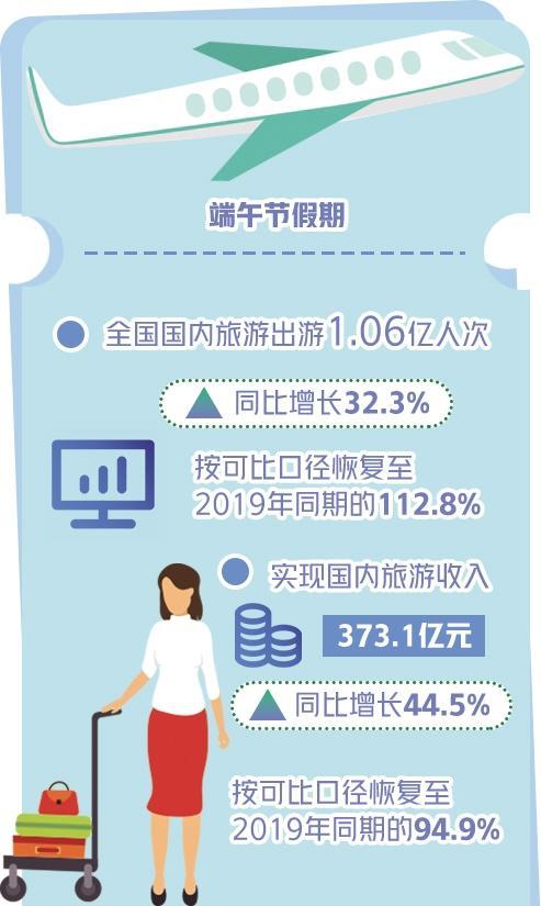 经文化和旅游部数据中心综合测算,端午节假期,全国国内旅游出游1.06亿人次,同比增长32.3%,按可比口径恢复至2019年同期的112.8%;实现国内旅游收入373.1亿元,同比增长44.5%,按可比口径恢复至2019年同期的94.9%。
