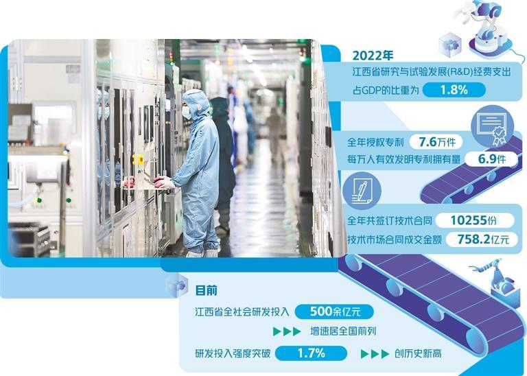 数据显示,目前,江西省全社会研发投入500余亿元,增速居全国前列;研发投入强度突破1.7%,创历史新高;高新技术产业增加值占规模以上工业企业增加值的比重39.8%;高新技术企业近7000家。