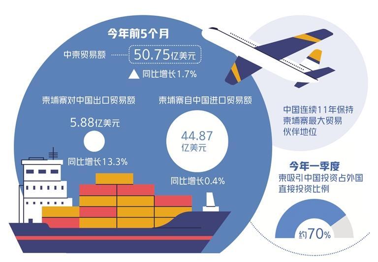 蒋国丰表示,《区域全面经济伙伴关系协定》(RCEP)和《中柬自贸协定》的生效为中柬经贸合作带来了巨大机遇。今年前5个月,中柬贸易额达到50.75亿美元,同比增长1.7%。其中,柬埔寨对中国出口贸易额为5.88亿美元,同比增长13.3%,柬埔寨自中国进口贸易额为44.87亿美元,同比增长0.4%。在美欧需求整体下滑的情况下,中国市场对柬埔寨尤为重要,中国陆续批准多种柬埔寨优质农产品进入市场,对促进双方贸易发挥了重要作用。中国已连续11年保持柬埔寨最大贸易伙伴地位。