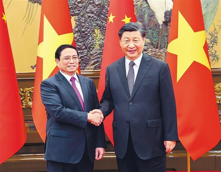 习近平指出,去年中共二十大闭幕后,我邀请阮富仲总书记来访,共同为中越关系发展定向把舵。今年是中越建立全面战略合作伙伴关系15周年,两国各层级交往日益密切,我同阮富仲总书记达成的共识正在得到落实。中方视越方为周边外交的优先方向和具有战略意义的命运共同体,这是中方基于两国关系长远发展作出的战略选择。面对日益严峻复杂的国际形势,中越两国要秉持平等互利、团结互信、合作共赢精神,携手合作、共谋发展,更好造福两国人民,为变乱交织的世界注入更多稳定性。