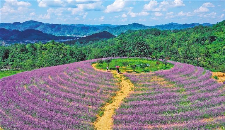6月26日,贵州省黔南布依族苗族自治州福泉市陆坪镇松江村麦田湾花海景区内,游客在观赏马鞭草花。近年来,当地以花草为媒,依托生态山林、田园景色等发展乡村旅游项目,带动农副产品销售、餐饮、民宿等产业发展,促进农民增收,助推乡村振兴。易盛武摄(中经视觉)