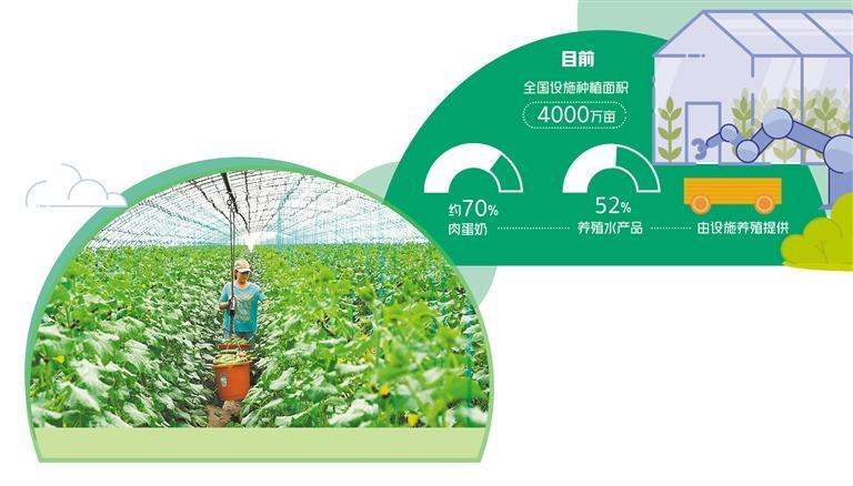 现代设施农业是诸多先进要素的集成平台,是现代农业皇冠上的一颗明珠。发展现代设施农业,可以通过提高产出效率突破资源环境制约。据统计,一亩高端日光温室蔬菜年产量相当于露地产量的5倍至8倍,规模养殖场、工厂化循环水养殖用地比传统养殖模式节省90%。按照《全国现代设施农业建设规划(2023—2030)年》,到2030年,设施蔬菜产量占比提高到40%,畜牧养殖规模化率达到83%,设施渔业养殖水产品产量占比达到60%。