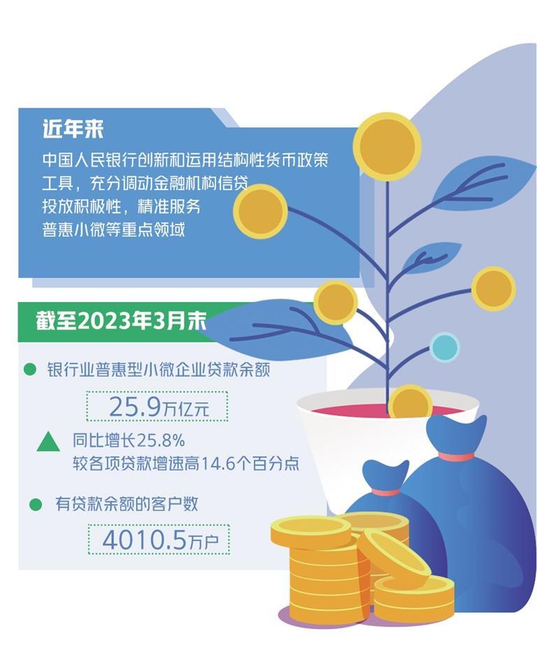 近年来,中国人民银行创新和运用结构性货币政策工具,充分调动金融机构信贷投放积极性,精准服务普惠小微等重点领域。截至2023年3月末,银行业普惠型小微企业贷款余额25.9万亿元,同比增长25.8%,较各项贷款增速高14.6个百分点;有贷款余额的客户数达到4010.5万户。