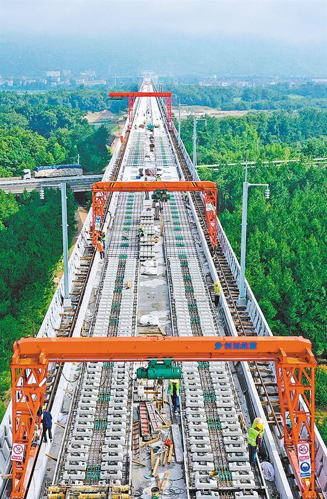 七月三日,工人们在杭温铁路浙江省台州市仙居特大桥现场施工,保证项目如期推进。王华斌摄(中经视觉)