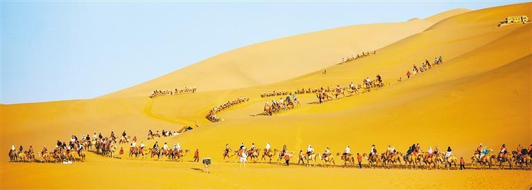 7月2日,在甘肃省敦煌市鸣沙山月牙泉景区,游客骑乘骆驼感受大漠风光。近年来,敦煌市持续加强文旅品牌建设,完善基础设施配套服务功能,推动文旅产业高质量发展。