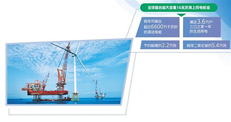 下一步,完成吊装的16兆瓦风电机组将进入并网前的调试和试验阶段,预计在7月上旬并网发电。根据该海域多年测风数据计算,仅这一台机组每年可输出超过6600万千瓦时的清洁电能,满足3.6万户三口之家一年的生活用电,节约标煤约2.2万吨,减排二氧化碳约5.4万吨。