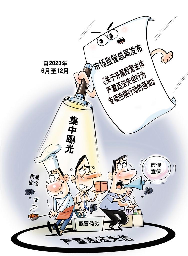 市场监管总局6月30日发布《关于开展经营主体严重违法失信行为专项治理行动的通知》,自2023年6月至12月,开展经营主体严重违法失信行为专项治理行动。专项治理行动聚焦线上线下食品安全、假冒伪劣、虚假宣传、虚假违法广告、出具虚假检验检测报告、未经许可生产特种设备和销售未经许可生产的特种设备、无证出厂销售CCC目录内产品等经营主体严重违法失信突出问题,出重拳、下猛药,加大整治力度。重点排查一批严重违法失信案件线索,有力惩戒一批严重违法失信经营主体,对存在“屡禁不止、屡罚不改”情形的经营主体予以集中曝光,形成强大震慑,维护消费者能够放心消费的市场环境。(时 锋)