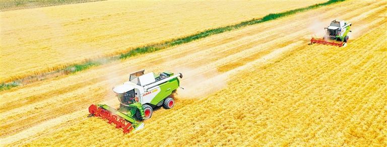 7月5日,农机手驾驶收割机在新疆昌吉回族自治州呼图壁县二十里店镇小土古里村的麦田里穿梭作业。连日来,当地积极组织人力和机械,抢抓小麦收割进度,确保颗粒归仓。