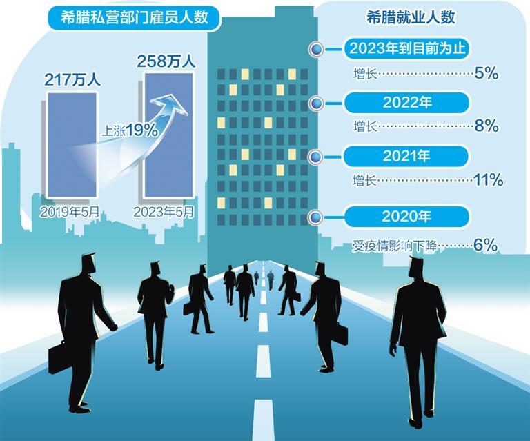 自2021年起,希腊经济从新冠疫情冲击中逐渐恢复,“用工旺”的现象随之显现。2019年5月,希腊私营部门雇员人数为217万人,而2023年5月就业人数与之相比增加了19%,达到258万人。受疫情影响,希腊2020年就业人数一度下降6%,此后的数据“一路反弹”,其中2021年增长11%,2022年增长8%,2023年到目前为止增长5%。