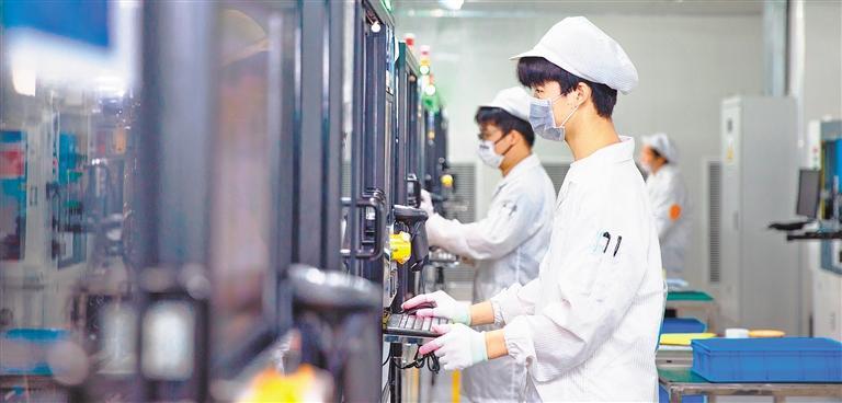 7月7日,江西鹰潭高新技术产业开发区一家柔性电子元器件生产企业,员工正在操作智能设备赶制5G通信电路板元器件。近年来,鹰潭高新区围绕国家新型工业化产业(移动物联网)示范基地定位,壮大移动物联网产业集群,拥有企业180余家,形成了覆盖通信模组、智能终端、网络安全、智慧城市应用集成、测试认证的全产业链条。