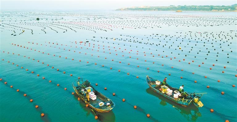 7月5日,山东省荣成市寻山海洋牧场筏式养殖区,渔民们正驾驶养殖船为鲍鱼投放饵料。自开展海洋牧场示范区建设以来,荣成市推进水产养殖生态优先、绿色发展,积极探索建设“资源修复+生态养殖+优质高效”的海洋生态牧场综合体,海洋牧场的规模、体量、海水质量等指标均居全国前列。