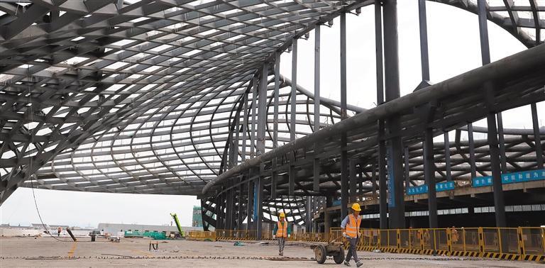 7月13日,浙江省台州市路桥机场改扩建项目施工现场,工人战高温赶进度。该项目是浙江省重点建设项目,总投资约35.88亿元。项目将新建1条长2500米的平行滑行道及端联络道等滑行道系统,16个机位的站坪及飞行区附属设施,3.5万平方米的航站楼以及综合楼、货运站、停车库、航管楼、塔台等配套设施。蒋友青摄(中经视觉)