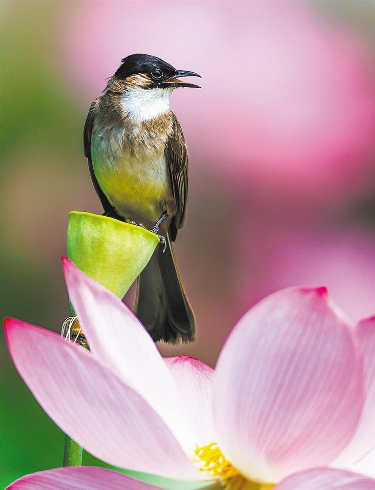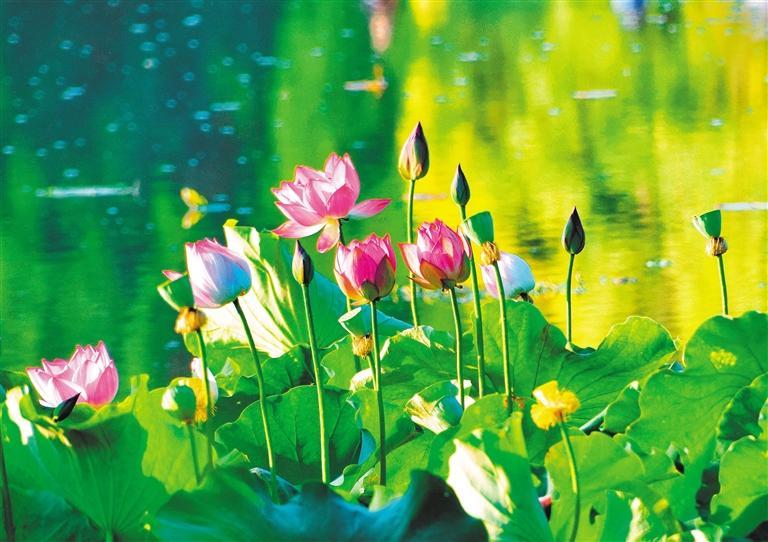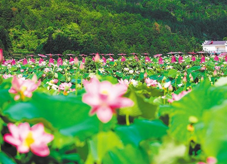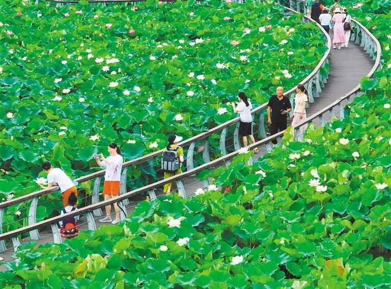 ▲7月1日,四川省遂宁市圣莲岛上的近百种荷花争奇斗艳、竞相开放,吸引游客前来观赏。
