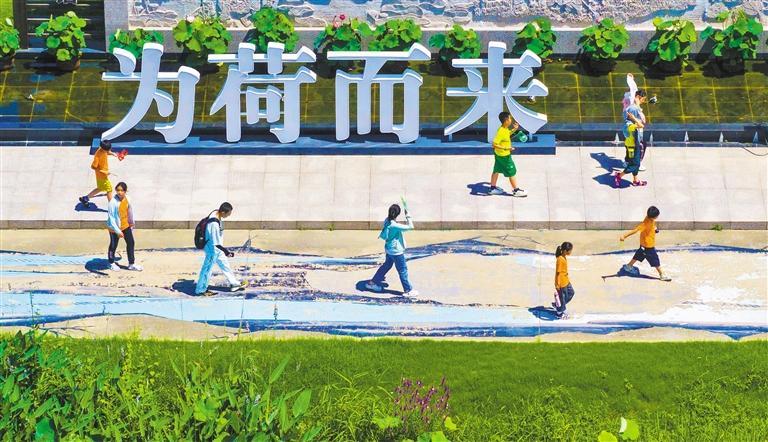 ◀7月1日,游客在湖北省襄阳市襄城区尹集乡姚庵村荷塘拍照留念。