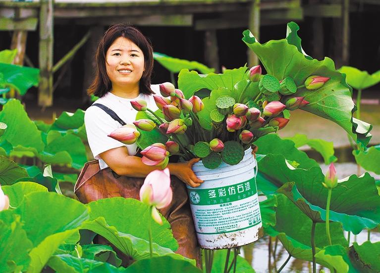 ▶6月27日,浙江省舟山市普陀田园综合体,员工在荷花池内采摘荷花准备制作干花。