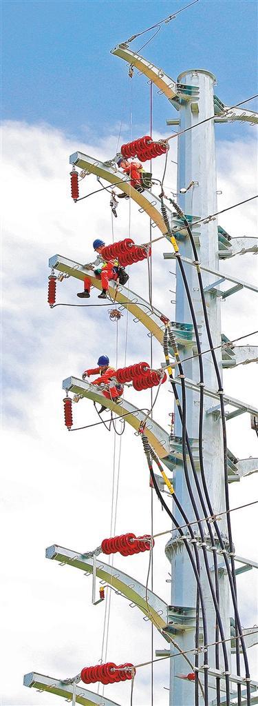 ▶7月11日,山东威海市环翠区,电力工人在高空接装上塔电缆,确保电网基建工程按期推进。