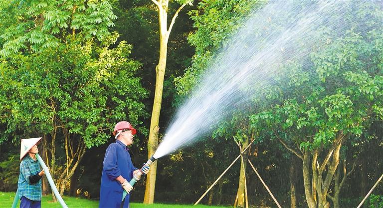 ▼7月14日,浙江台州市路桥区桐屿街道文化路,园林工人在公园给景观树浇水,做好补水养护。