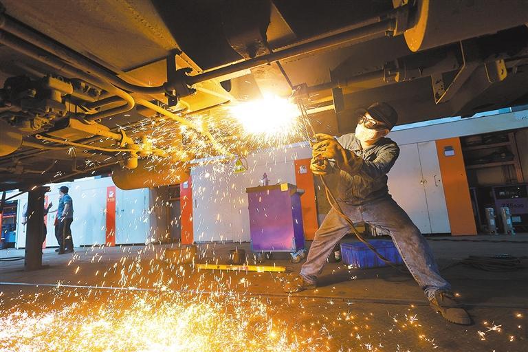 ◀7月11日,中国铁路成都局集团有限公司重庆西车辆段检修库,电焊工人冒着高温进行焊接作业,确保暑运车辆安全运行。