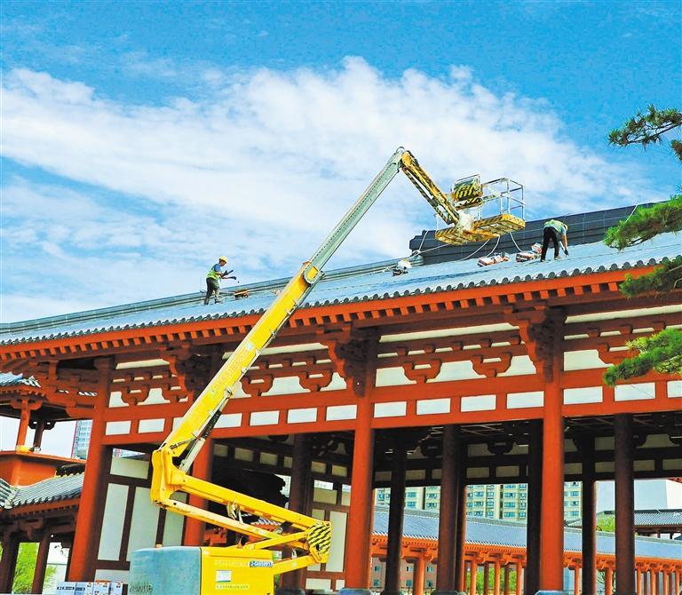 ▶7月14日,工人在河南南阳市医圣文化园项目建设现场加紧施工。南阳医圣文化园主体场馆是国家中医药博物馆医圣馆,总建筑面积30500平方米,建成后是国内最大的中医药博物馆。