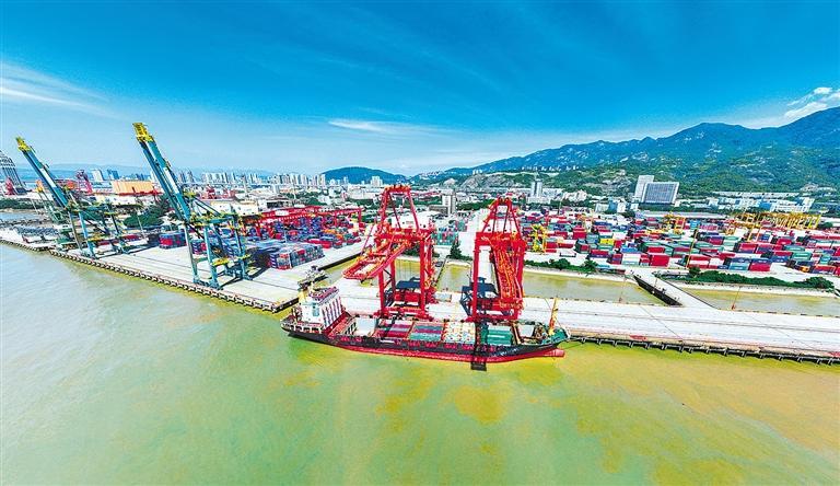 位于福建省福州市马尾区的福州青州集装箱码头,泊位上的集装箱大型船舶正在进行吊装作业。近年来,当地积极推动现代化智慧港口建设,助力进出口和内外贸业务实现量质齐升。谢贵明摄(中经视觉)