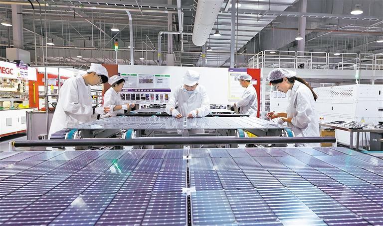 7月12日,江苏省宿迁市泗洪经济开发区一家光伏板企业生产车间内,工人们正在赶制出口订单。近年来,泗洪县大力发展光伏新能源产业,积极打造新能源利用及装备制造基地。目前,泗洪经济开发区企业生产的光伏板组件产品已销往60多个国家和地区。许昌亮摄(中经视觉)