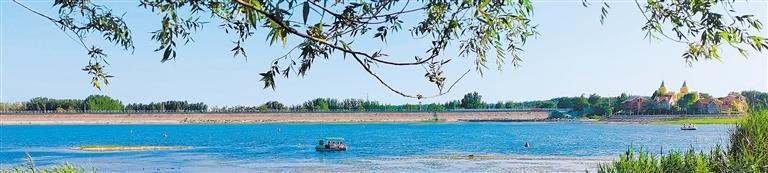 ▼7月19日,新疆维吾尔自治区巴里坤县高家湖湿地天蓝水清,绿草如茵,吸引各地游客前来避暑游玩。王传生摄(中经视觉)
