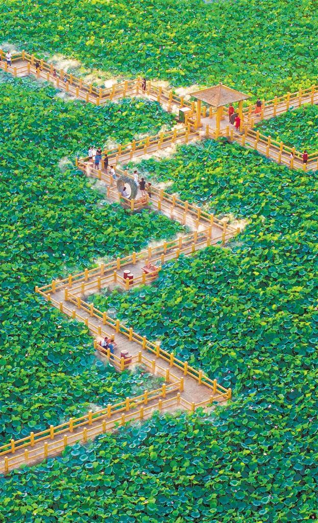 ◀7月19日,位于太行山革命老区的河北省易县桥头乡摇头村荷花竞相绽放,游客行走在曲折的栈道上,闻香赏花,乐享夏日美景。