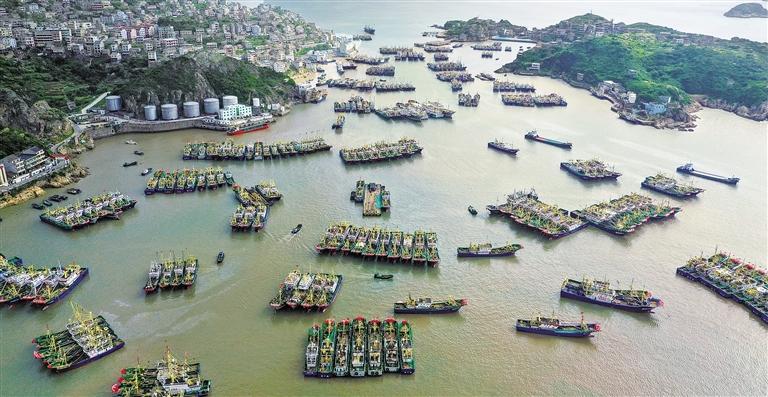 7月22日,浙江省温岭市石塘镇钓浜渔港,500艘渔船有序停泊,防御今年第5号台风“杜苏芮”。截至当日,温岭市已有2000多艘渔船回港避风,渔民们在船上收集网具、加固缆绳,并进行前后抛锚,提升渔船的抗风能力。周学军摄(中经视觉)