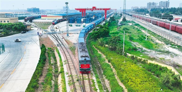 七月二十四日,“燕赵号”中越班列从河北省石家庄国际陆港驶出(无人机照片),驶往越南首都河内,标志着石家庄连接越南的陆路贸易通道正式开通。