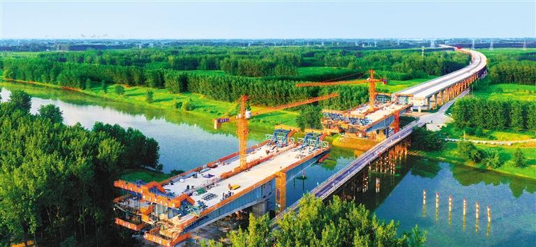 7月23日,在江苏省宿迁市泗洪县朱湖镇,盐洛高速公路宿城至泗洪段洪泽湖滞洪区特大桥工程建设者在抓紧施工。该桥为目前江苏省内主跨径最大的波形钢腹板公路桥梁,计划10月底合龙。盐洛高速宿泗段路线全长38.18公里,其建成将有效带动淮河生态经济带建设,促进沿线区域经济社会发展。