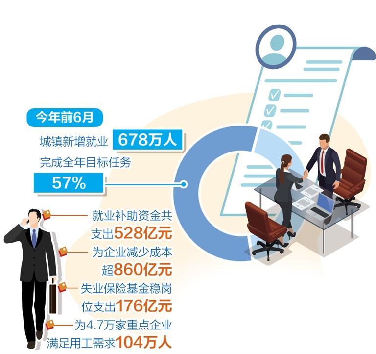 就业稳定来自于经济运行趋势企稳向好,对就业支撑力不断增强。就业优先政策落实落细、稳就业政策优化调整、一次性扩岗补助政策延续实施,有效激励了企业积极吸纳就业。数据显示,上半年就业补助资金共支出528亿元,阶段性降低失业、工伤保险费率为企业减少成本超860亿元,失业保险基金稳岗位支出176亿元。