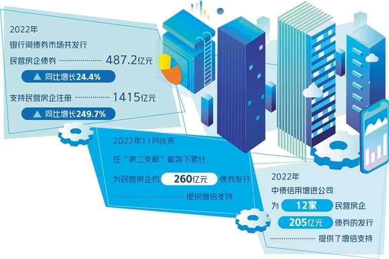 专家认为,银行间债券市场对民营房企的支持有力扭转了市场投资者风险偏好过度收缩的行为,保障了房地产企业在银行间市场融资渠道畅通。数据显示,2022年银行间债券市场共发行民营房企债券487.2亿元,同比增长24.4%;支持民营房企注册1415亿元,同比增长249.7%。