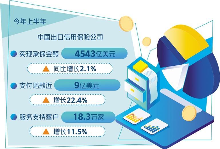 7月20日,中国出口信用保险公司公布的数据显示,公司上半年实现承保金额4543亿美元,同比增长2.1%;支付赔款近9亿美元,增长22.4%;服务支持客户18.3万家,增长11.5%。中国信保董事长宋曙光说:“我们既要稳住业务规模,发挥主渠道作用;又要不断优化业务结构,持续推动业务做实;还要提质增效,培育业务发展新优势。”
