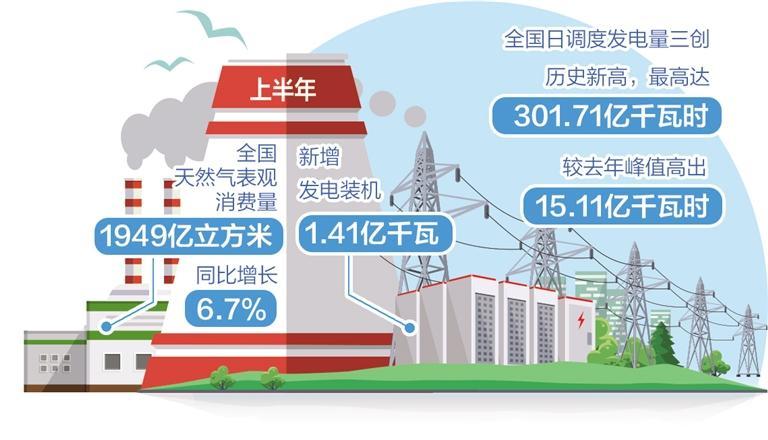 “在需求较快增长、水电大幅减发交织叠加的情况下,通过采取综合措施,保障了全国电力安全稳定供应。”欧鸿介绍,在煤炭方面,今年以来,煤炭产量稳步增长,进口增加较快,煤炭供需总体平衡。电煤中长期合同签订充足,履约率高,统调电厂存煤处于历史高位。截至目前,全国统调电厂存煤1.98亿吨,较去年同期增加2300万吨以上,可用近26天。天然气生产、进口均保持平稳增长,有效保障了民生和工商业用气需要。数据显示,上半年全国天然气表观消费量1949亿立方米,同比增长6.7%。入夏以来,单日最高发电用气超过2.5亿立方米,有力支撑了气电顶峰出力。