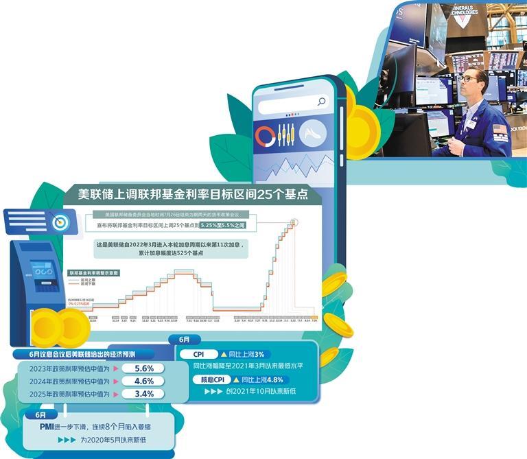 继6月“按兵不动”之后,美联储再启加息。当地时间7月26日,美联储在结束货币政策会议后宣布加息25个基点,将联邦基金利率目标区间上调到5.25%至5.50%之间,创2001年以来最高水平。这是美联储自2022年3月份开启本轮加息周期以来第11次加息,累计加息幅度达525个基点。在今年6月的货币政策会议后,美联储曾宣布暂停加息。