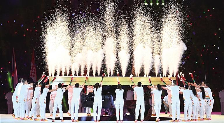 这是七月二十八日拍摄的开幕式点火仪式。当晚,第三十一届世界大学生夏季运动会开幕式在成都东安湖体育公园主体育场举行。新华社记者 张博文摄