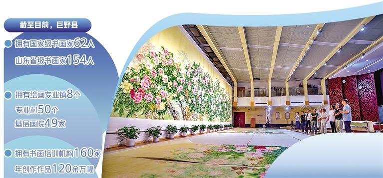 户户绘新枝、家家飘墨香。这不仅是巨野县乡村文化振兴的亮丽风景,也让当地发展了“画经济”。目前,巨野县拥有绘画专业镇8个、专业村50个,基层画院49家;拥有书画培训机构160家,年创作作品120余万幅,在全国纯手绘工笔牡丹市场中占有率达80%,并远销40多个国家和地区,年综合产值超20亿元。
