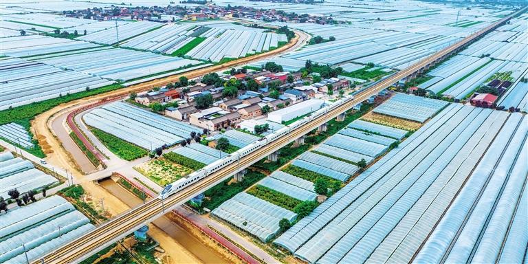 7月28日,一列“和谐号”列车正穿过山西省临猗县庙上乡的冬枣大棚种植区。近年来,当地加大鲜枣产业扶持力度,全县种植鲜枣面积达20万亩。薛 俊摄(中经视觉)