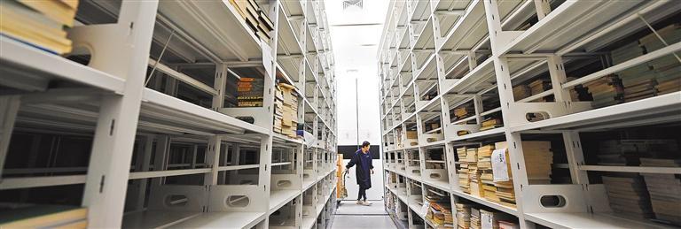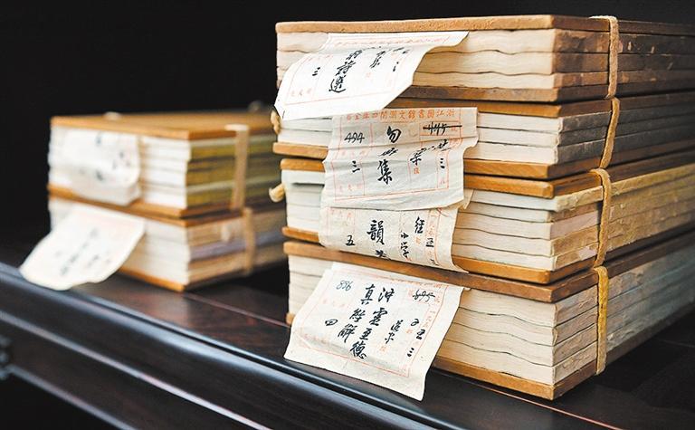 ▶工作人员在清点《四库全书》。中央总馆目前设有“龙藏雕版”“四库全书”等特色库展。